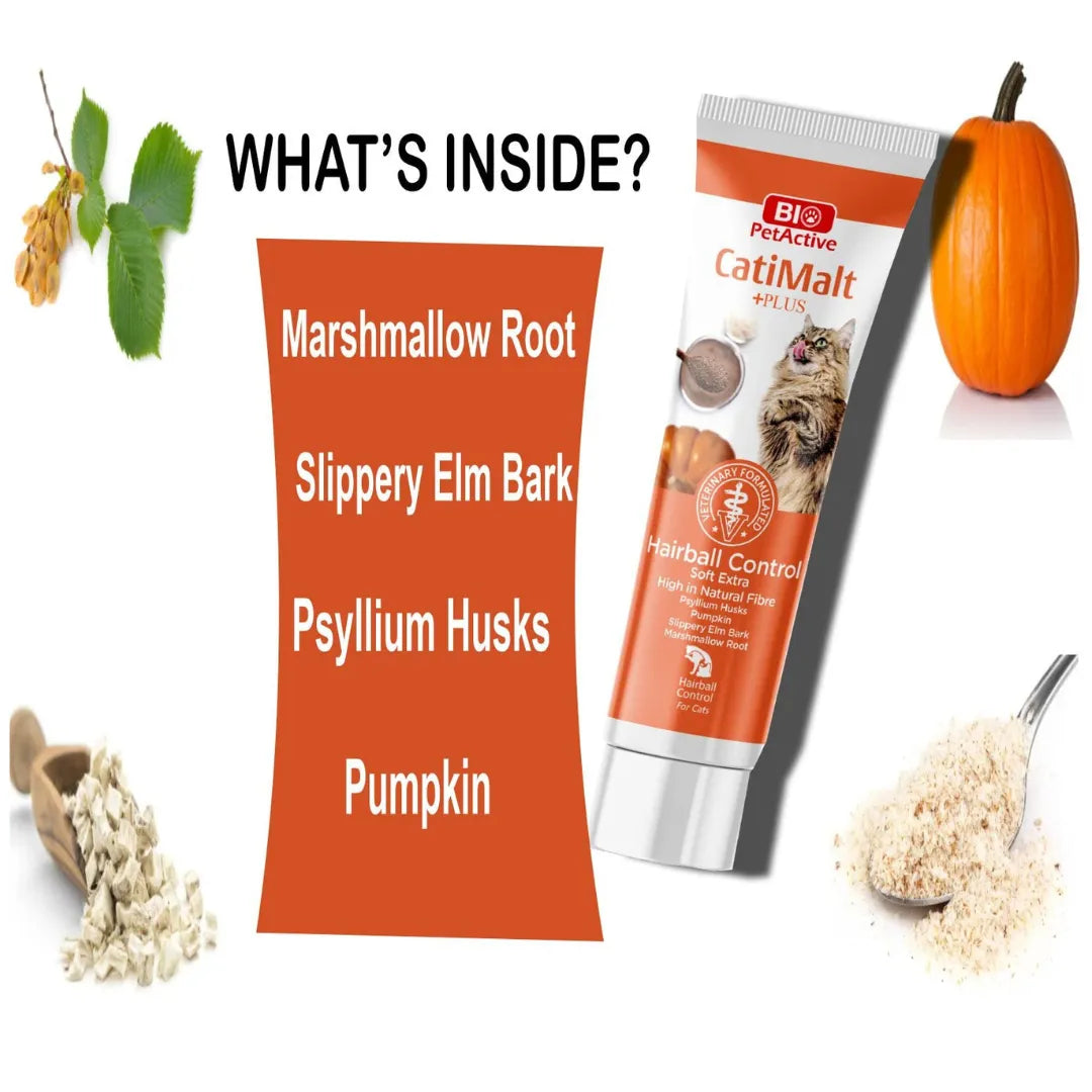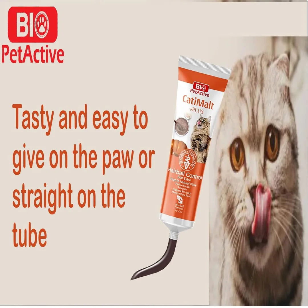 Catimalt Plus is a tasty hairball control paste specially formulated for cats to help prevent and eliminate hairballs naturally. Cats often swallow loose hair during self-grooming, which can lead to hairball vomiting, digestive discomfort, and constipation.