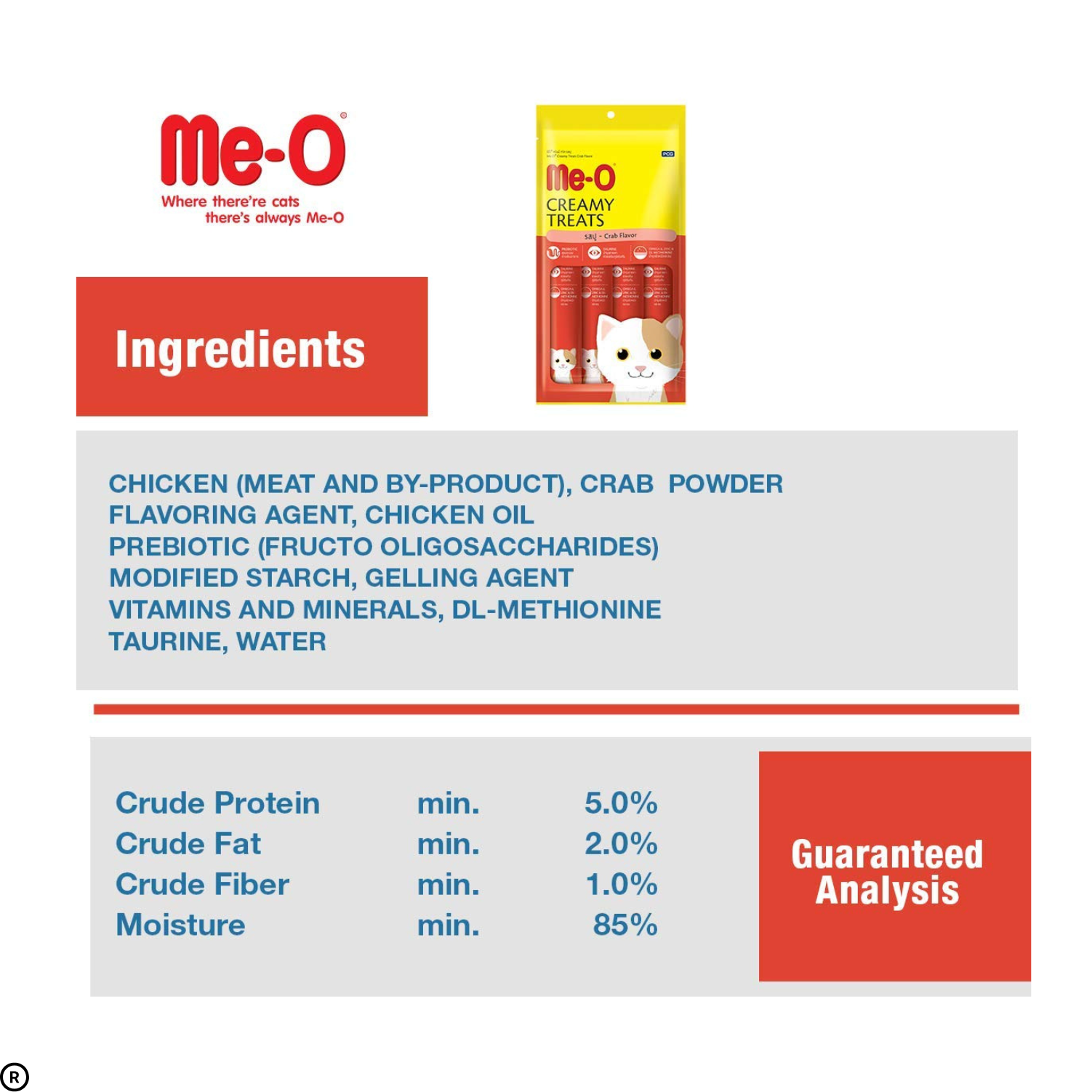 Me-O Creamy Treat Crab Flavour is a delicious and nutritious snack for cats, made with real seafood and chicken to enhance flavor and nutrition. The smooth, creamy texture makes it perfect for hand-feeding or using as a topper on dry food. Enriched with Taurine, Omega 3 & 6, Zinc, and Vitamin C, it supports eye health, skin and coat condition, and the immune system. Ideal for cats and kittens above 1 month of age, this treat contains no added preservatives and promotes bonding between pet and owner.