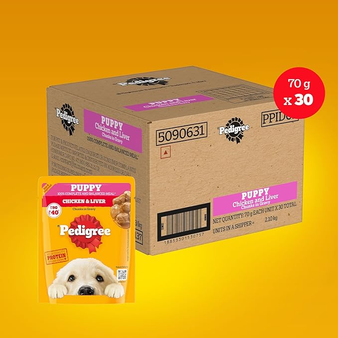 DELICIOUS TASTE: Pedigree Puppy Wet Dog Food, Chicken & Liver Chunks in Gravy, is produced using real meat, top-quality protein and includes a gravylicious taste.