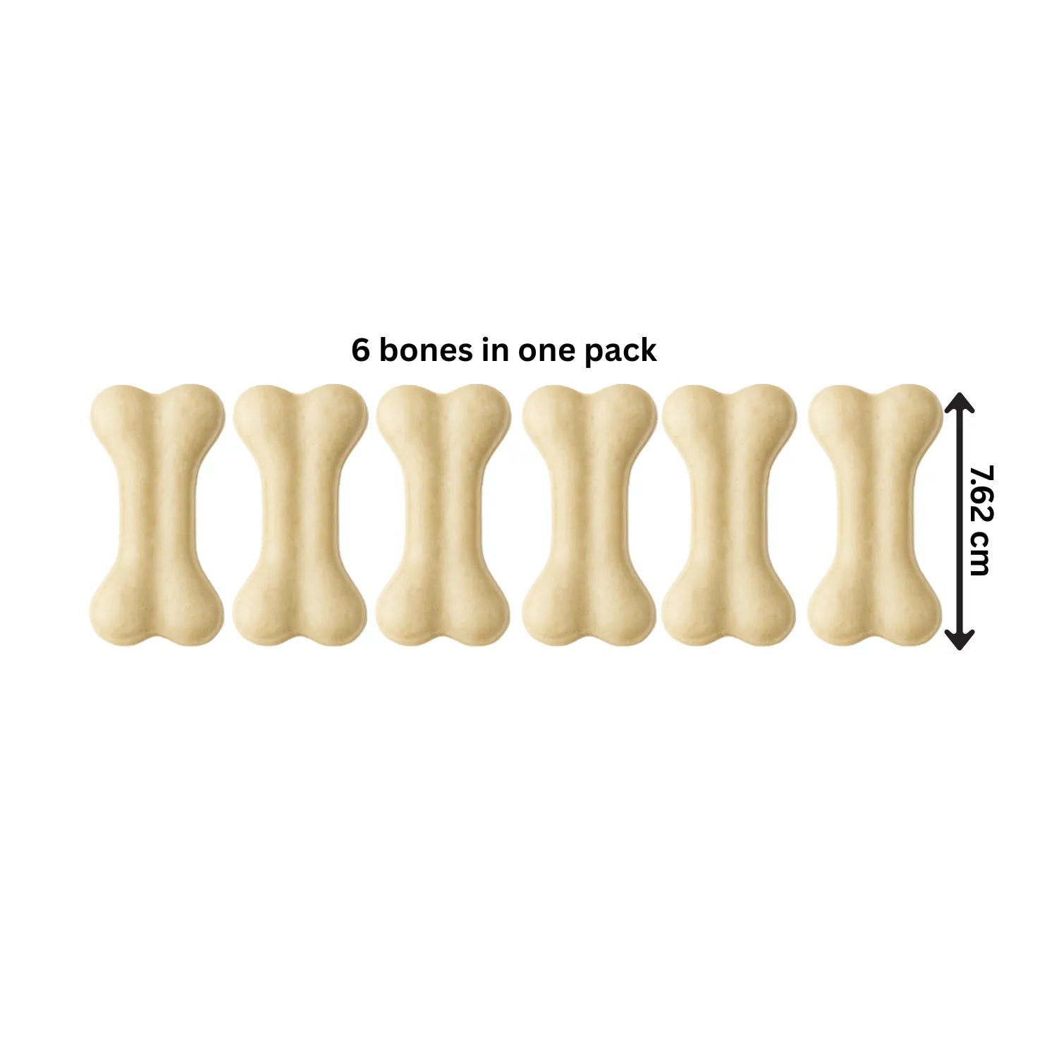 Pack of 6 bones, each approx. 3 inches (7.62 cm), hygienically sealed in a transparent pouch to maintain freshness.